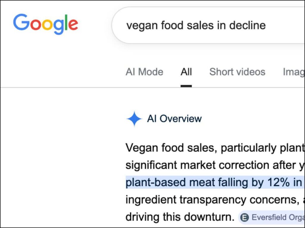 Even when trying to research the topic, the first thing that appears is an AI-generated overview — one I didn’t ask for, but I’ll use it anyway: “Vegan food sales, particularly plant-based meat alternatives …”